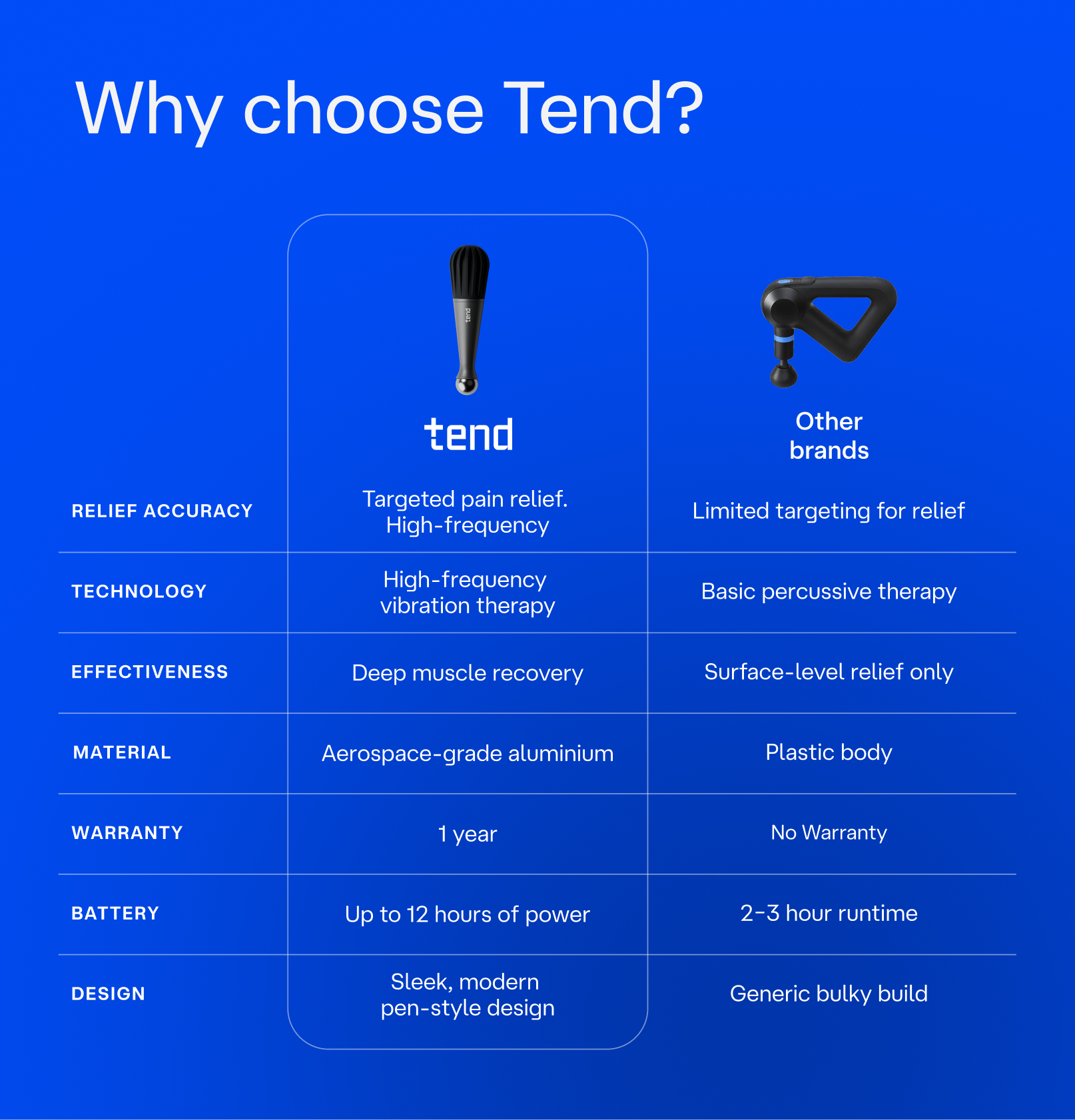 Experience pinpoint recovery with the Tend Focus. Designed to be held like a pen for maximum precision and control, this compact device delivers targeted vibration therapy to ease tension and support muscle and joint recovery in smaller, hard-to-reach areas. Lightweight and portable, Tend Focus helps you stay mobile and feel your best, wherever you need relief.